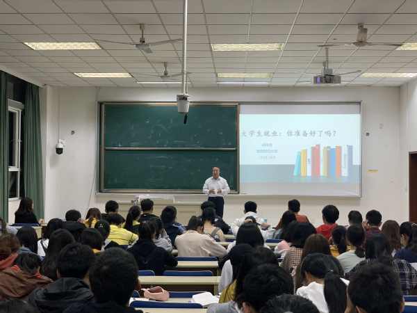 会议初始,胡书记用幽默的语言缓解了现场严肃的气氛。在简单介绍了当代大学生就业背景之后,胡书记为学生们分析了中国劳动力的市场特征、劳动力市场两极化等阻碍大学生就业的因素。继而谈到高等教育与就业关系时,他提到:“大学生要学会独立思考,最重要的是提高自身的主动性。而个体能力的提高,是就业、幸福之本。”