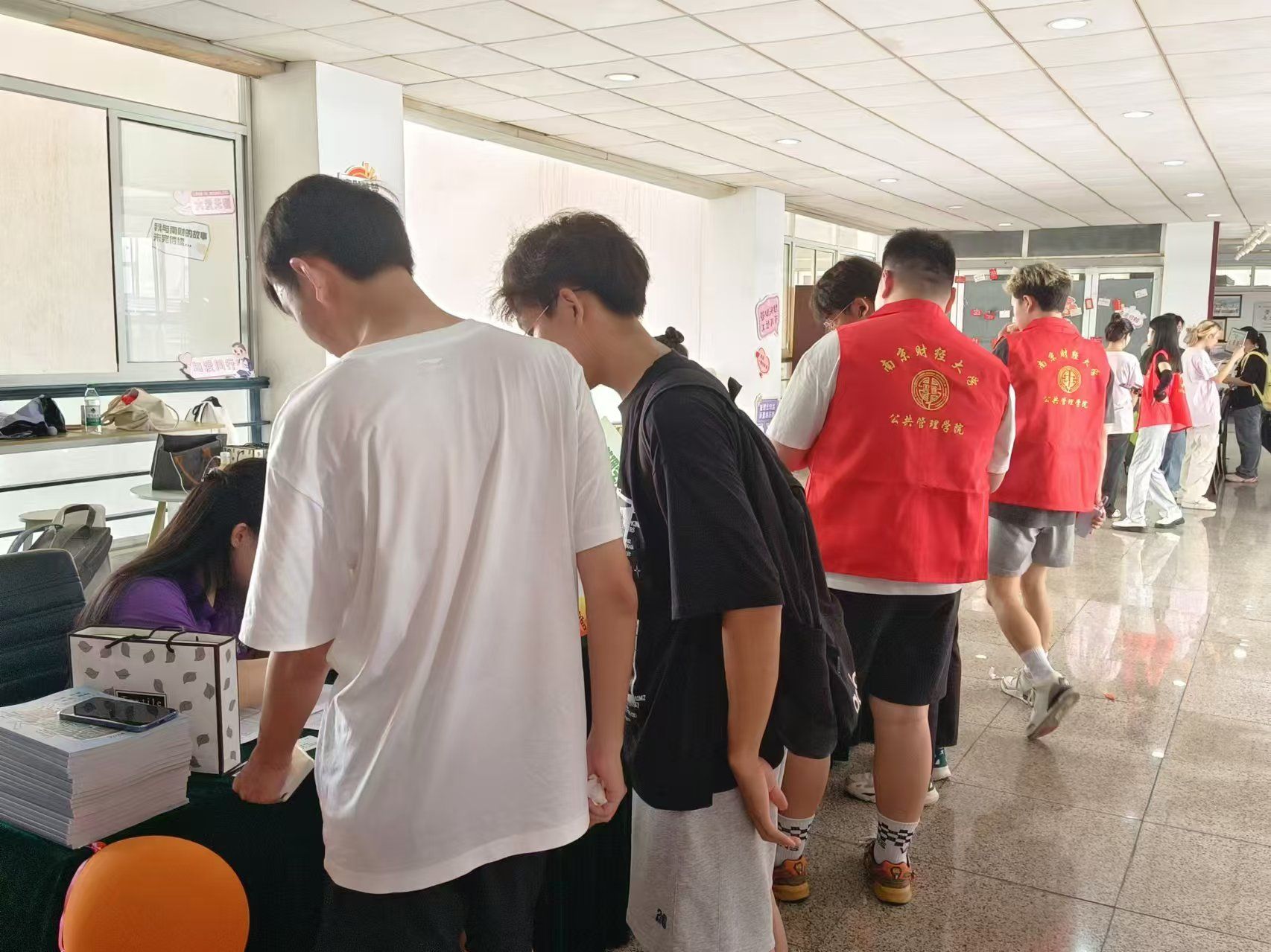 在专业楼里,志愿者们耐心细致地帮助新生们完成报道工作,学长学姐们翻开入学通知书仔细核验信息,递上新生礼品,在三言两语地热切交谈中送上关于新学期新生活的诚挚祝福。