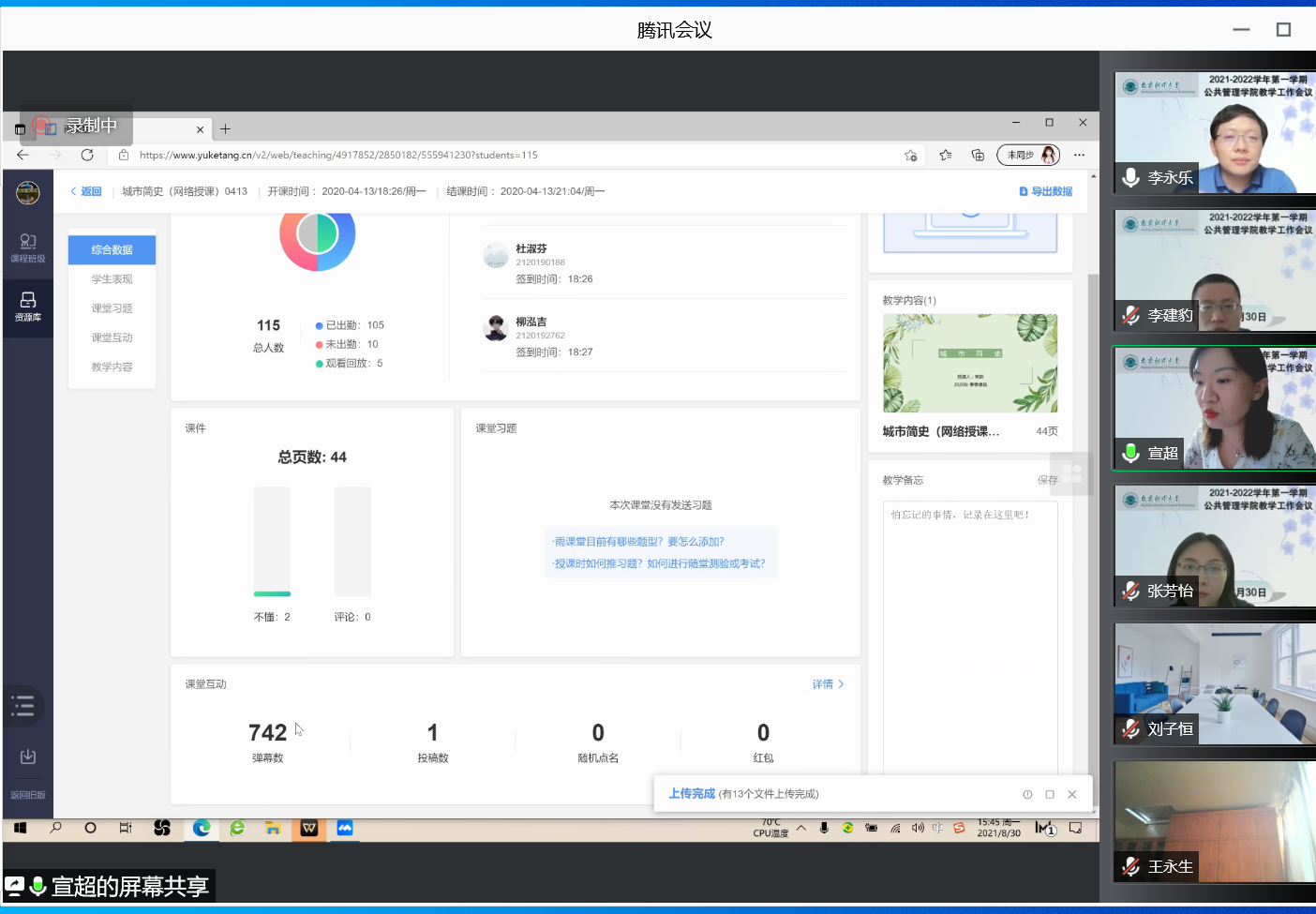 学院梁誉老师、方超老师、张芳怡老师、张丽芳老师、宣超老师、戴凤燕老师等六位青年教师结合所授课程对腾讯课堂、雨课堂、学习通等在线教学工具做了细致、详尽的演示和讲解。