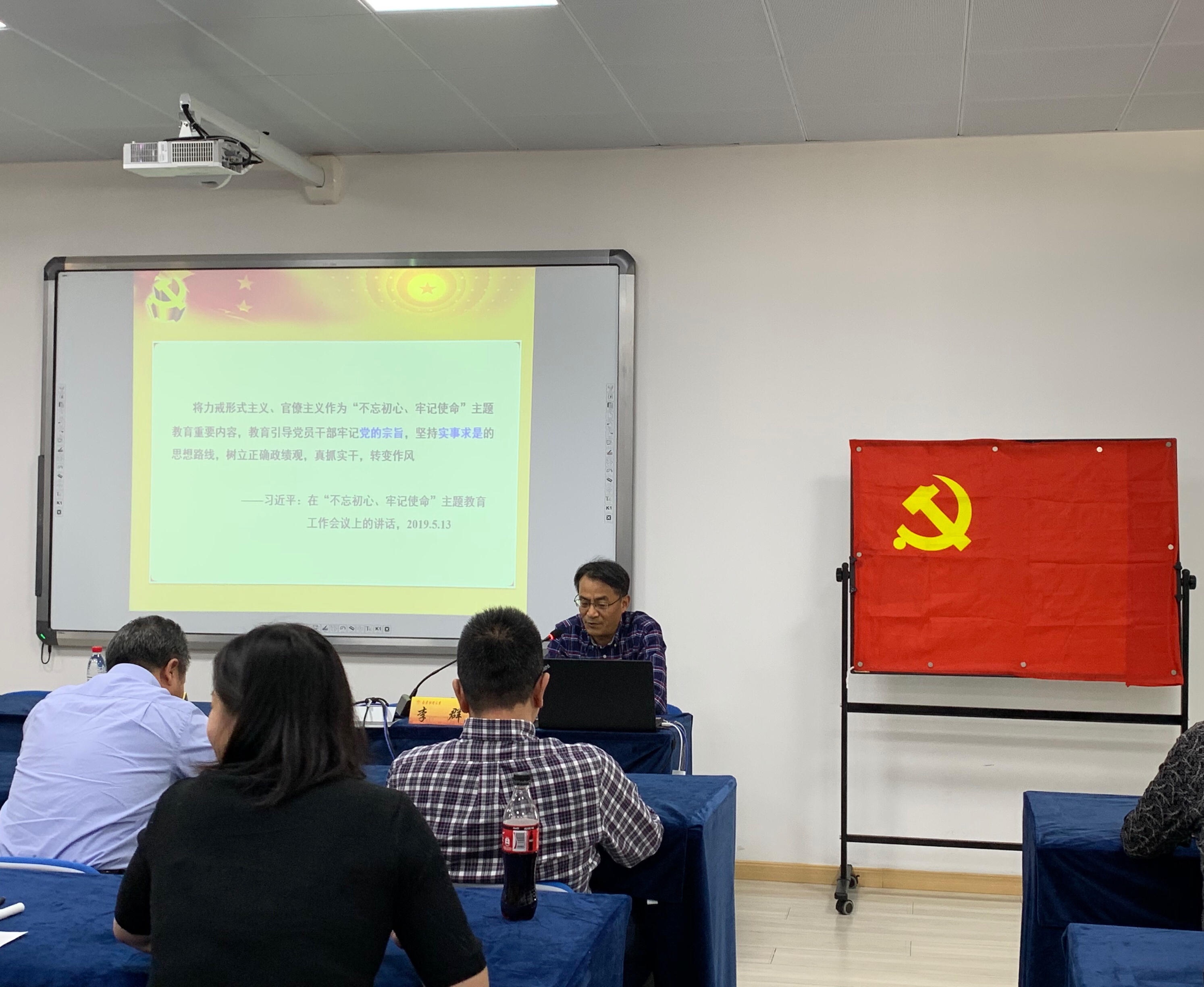 胡永远书记做总结。他说,李群副校长把党的实事求是的理论发展线索理得很清楚,观点阐述很透彻。每位党员要结合自己的工作实际,贯彻落实实事求是和群众路线。每位党员干部要认真查找发展过程中存在的突出问题,敢于担当,切实起到引领带头作用,同时还要充分调动广大师生的积极性,守初心、担使命,做好当前学院一级硕士点申报工作。