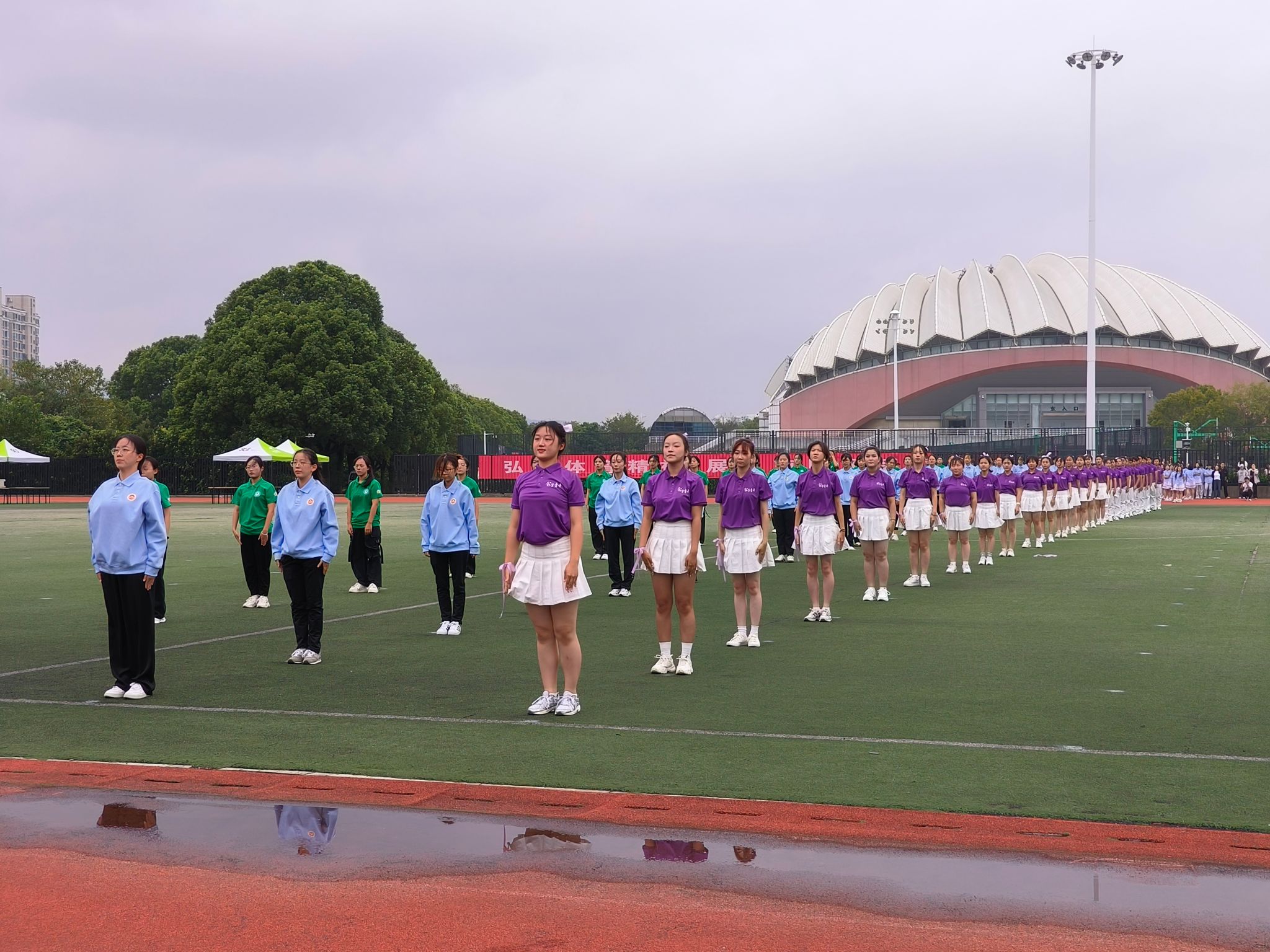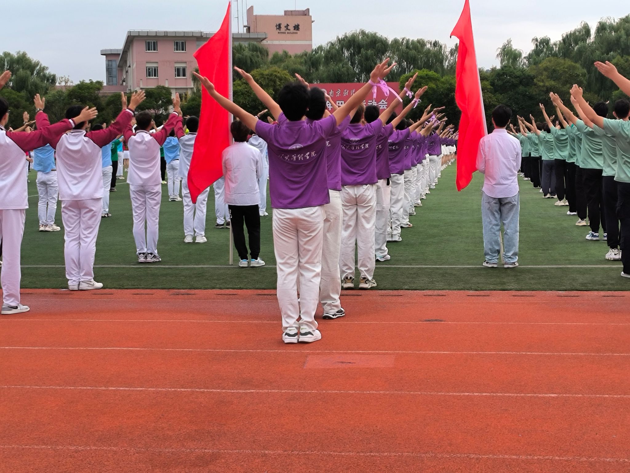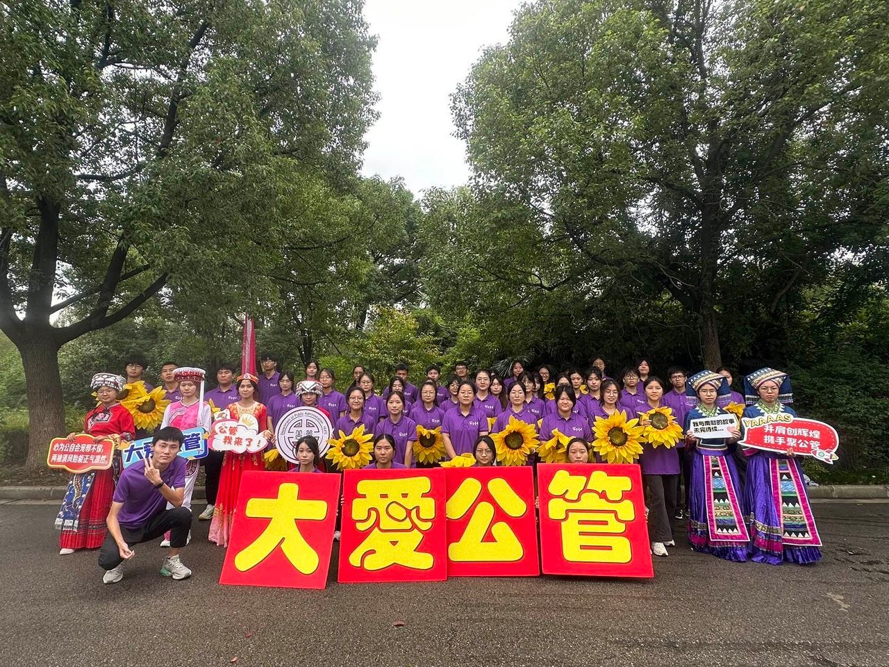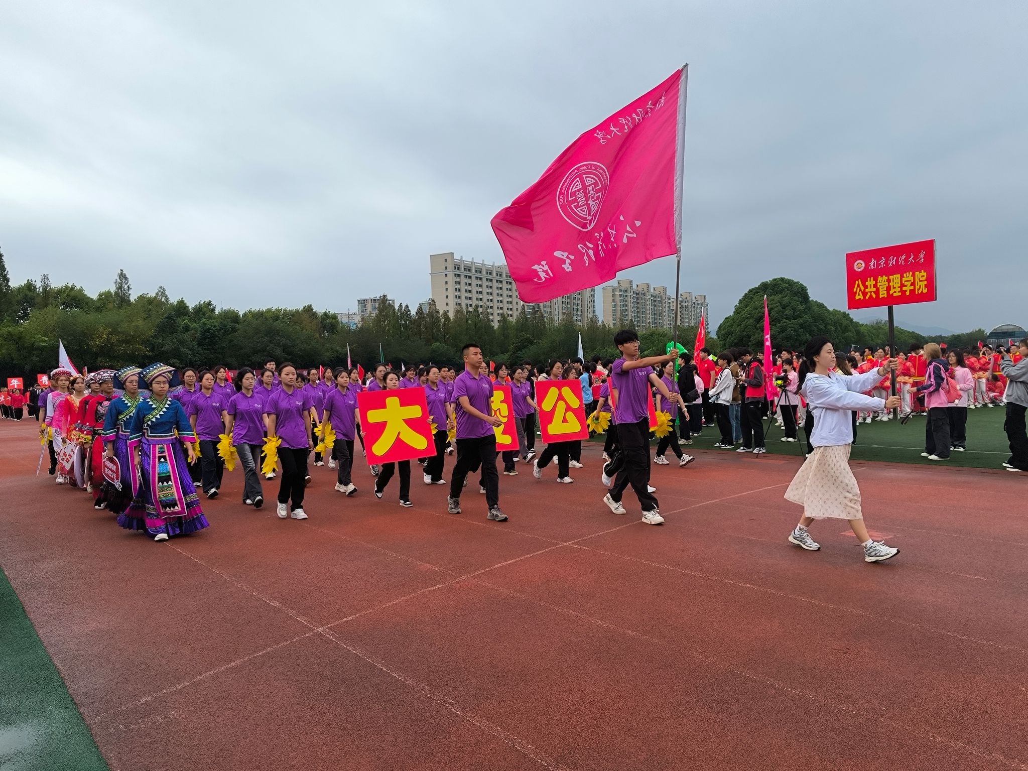 方阵的学生代表们身着紫衣白裤,手举向日葵,迈着整齐有力的步伐,将“大爱公管”的声音传遍整个操场。此外,还有少数民族同学身穿民族服饰行走于队列之中,更彰显了多样与团结的力量。广播操项目中,公管青年们大展青春风采,面带笑容,自信地做出每个动作,斩获广播操项目的二等奖。大乐透