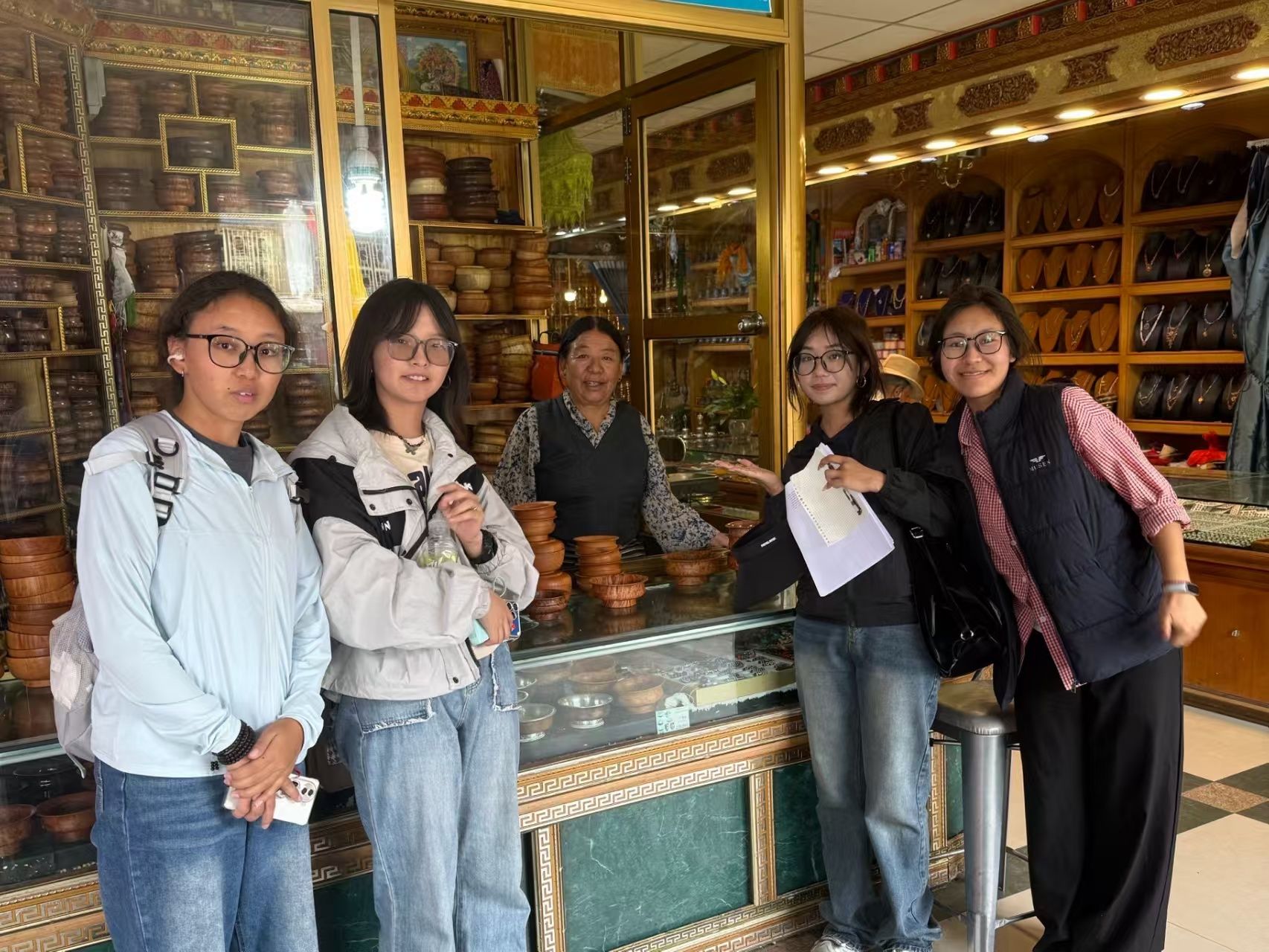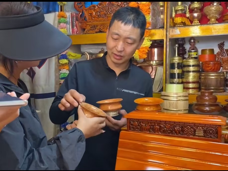 在大昭寺旁的“嗦嘎民族工艺品”店,45岁的店主伍金货架上排列整齐的藏木碗。他热情地拿出本店珍贵的木碗让团队人员亲手感受并欣赏。