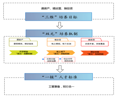 房地产开发与管理专业以社会主义核心价值观为引领,强化立德树人根本宗旨,以满足房地产转型发展需要为导向,服务于新型城镇化和长三角高质量一体化发展战略,培养德智体美劳全面发展,具备良好经济学和管理学素养,拥有“通开发、精策划、融投资”综合能力的高素质应用型专门人才,建成特色鲜明的一流本科专业。现已形成“三维”并重、“四化”并举、“双元”并行的专业特色。