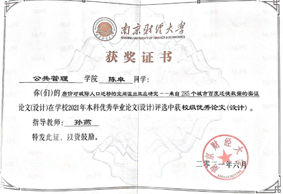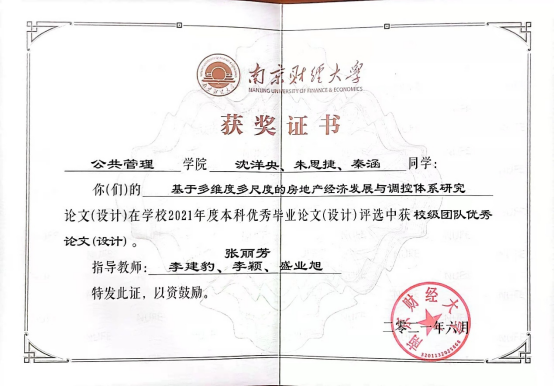 2017级房地产开发与管理专业学生陈卓的毕业论文“房价对城际人口迁移的空间溢出效应研究——来自285个城市百度迁徙数据的实证”(指导老师:孙燕)在大乐透 2021年度本科优秀毕业论文评选中获得校级优秀论文;沈洋央、朱思捷、秦涵等同学的论文“基于多维度多尺度的房地产经济发展与调控体系研究”(指导老师:张丽芳、李建豹、李颖、盛业旭)获校级团队优秀论文。