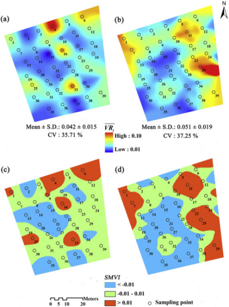 图3茶园全年(2014/03/01-2015/02/28)不同样点的土壤水分平均变化率及SMVI(土壤水分变化指数)(a)和(c)为0.1m,(b)和(d)为0.3m。