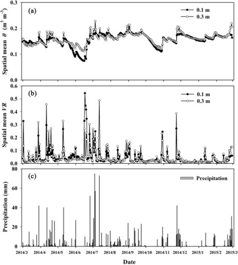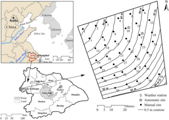 论文以太湖流域典型茶园坡面为例(图1),集成高空间分辨率的土壤水分手动监测数据和高时间分辨率的自动监测数据,基于前期研究中所构建了高时空分辨率的坡面土壤水分分布预测优化模型,预测了2014年3月至2015年2月一个完整自然年份日尺度的不同深度(10和30 cm)的土壤水分的空间分布格局。在此基础上,采用多种GIS空间分析技术,提取了日尺度土壤水分变化信息(Variation rates,VR),识别茶园在典型降雨事件(大雨、中雨和小雨)、月份尺度和季节尺度土壤水分变化的热点时间和热点区域(Hot moments/spots)及其控制因素。