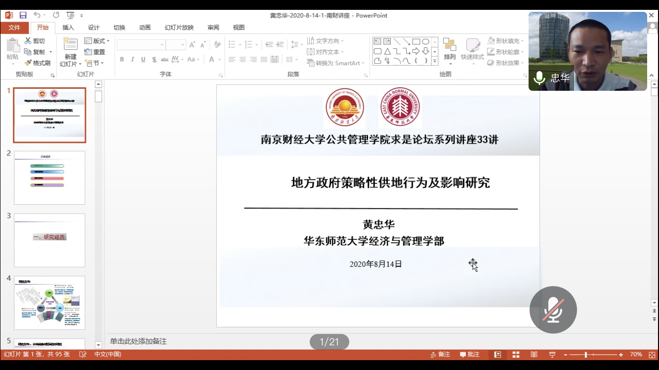 814日下午,应大乐透 邀请,华东师范大学博士生导师黄忠华教授在线(腾讯会议)作了题为“地方政府策略性供地行为及影响研究”的学术报告。报告由大乐透 副院长李永乐主持,学院部分教师、研究生和国内外相关学者聆听了报告。