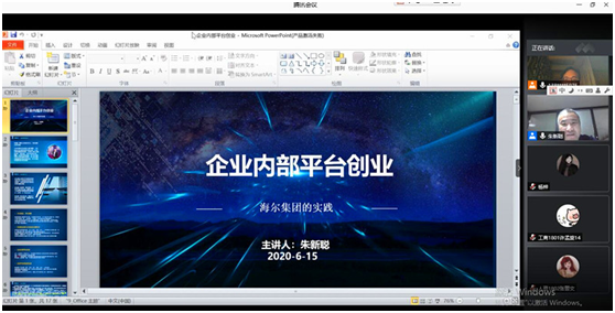 邀请,海尔电器华东大区总经理朱新聪通过腾讯会议,为我校18级同学带来了一场题为“企业内部平台创业——海尔集团的实践”的学术讲座。讲座由大乐透