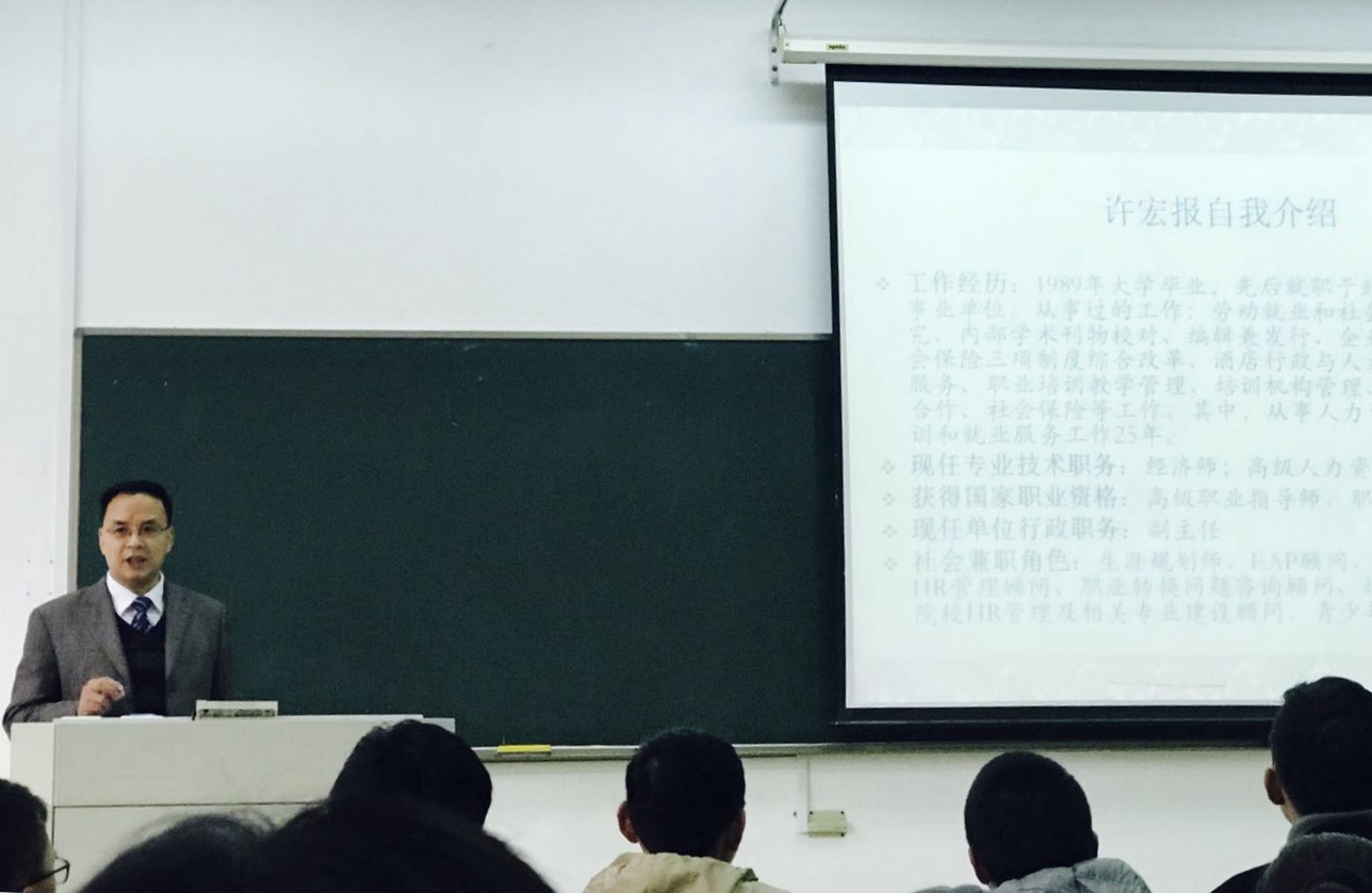 11月22日下午,南京市职业技术培训指导中心副主任许宏报在我校仙林校区德正楼作主题为“大学、专业、未来”的学术讲座,大乐透 劳动与社会保障专业任课教师与1701班全体同学聆听了此次讲座。