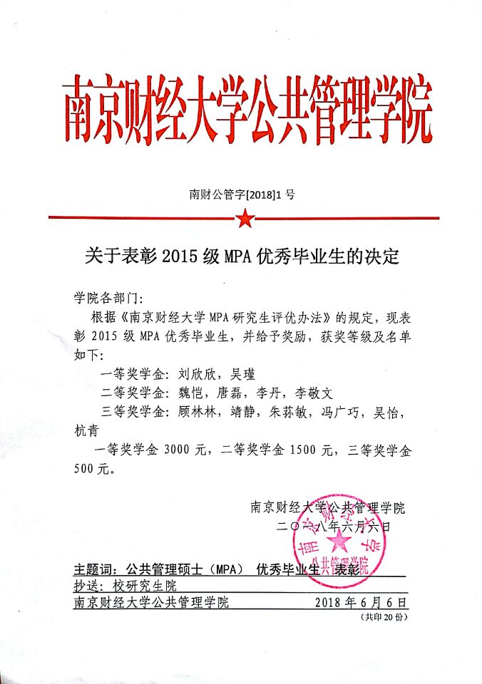 关于表彰2015级MPA优秀毕业生的决定