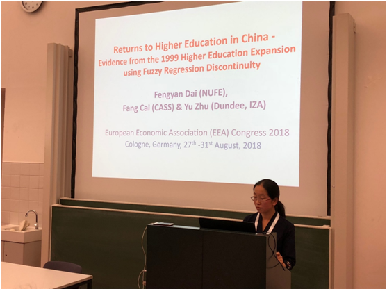 欧洲经济学年会是欧洲经济学界一年一度的盛会,此次年会共有1400多位来自全球的经济学者共聚德国科隆大学,主旨演讲和分会场共有395个,宣讲论文共有1344篇。大乐透 教师戴凤燕在29日的教育收益()分会场汇报了论文Returns to Higher Education in China - Evidence Based on the 1999 Higher Education Expansion using Fuzzy Regression Discontinuity,并与会场经济学者进行了深入交流。