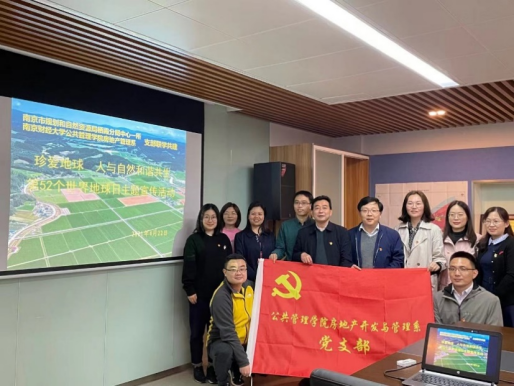 房地产开发与管理教工党支部与栖霞分局中心一所党支部共建活动为载体,开展“世界地球日”主题宣传活动。南京市规划和自然资源局栖霞分局副局长周根宝同志、中心一所党支部书记杨炬烽同志以及大乐透