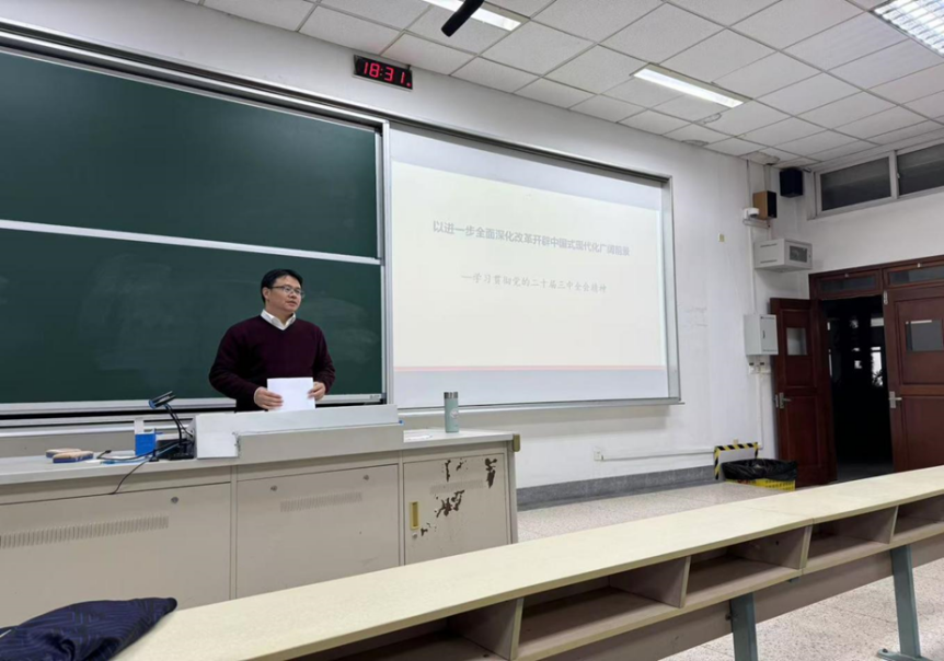院长、研究生党支部政治辅导员黄建伟教授在德济楼112教室为研究生党支部全体党员讲授题为“以进一步全面深化改革开辟中国式现代化广阔前景——学习贯彻党的二十届三中全会精神”的专题党课。研究生党支部全体党员和党的发展对象参加党课学习。