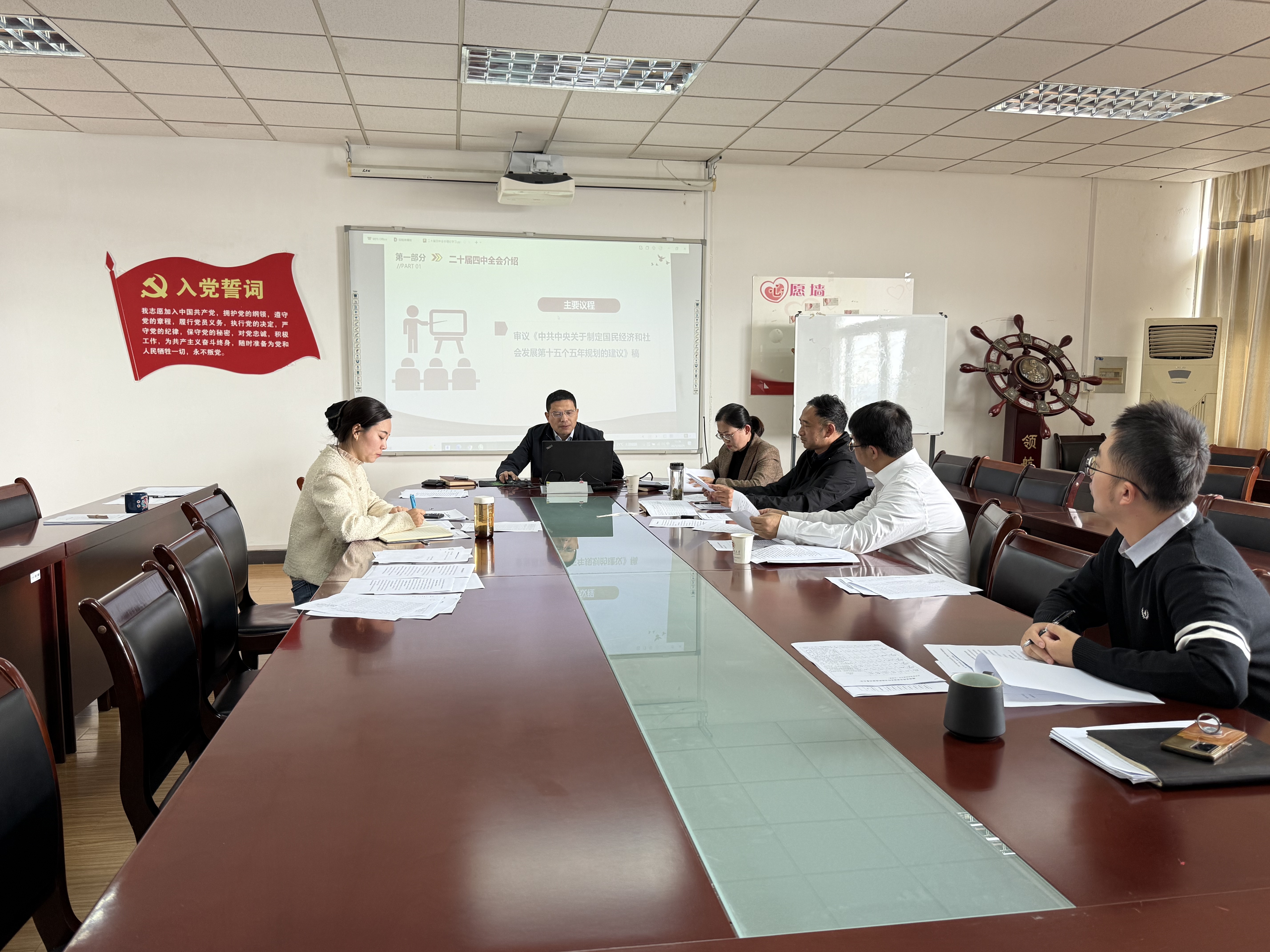 在508会议室召开党委理论学习中心组集中研讨会,传达学习习近平总书记在党的二十届四中全会上的重要讲话和全会精神。学院党委书记陈翔主持会议并领学。